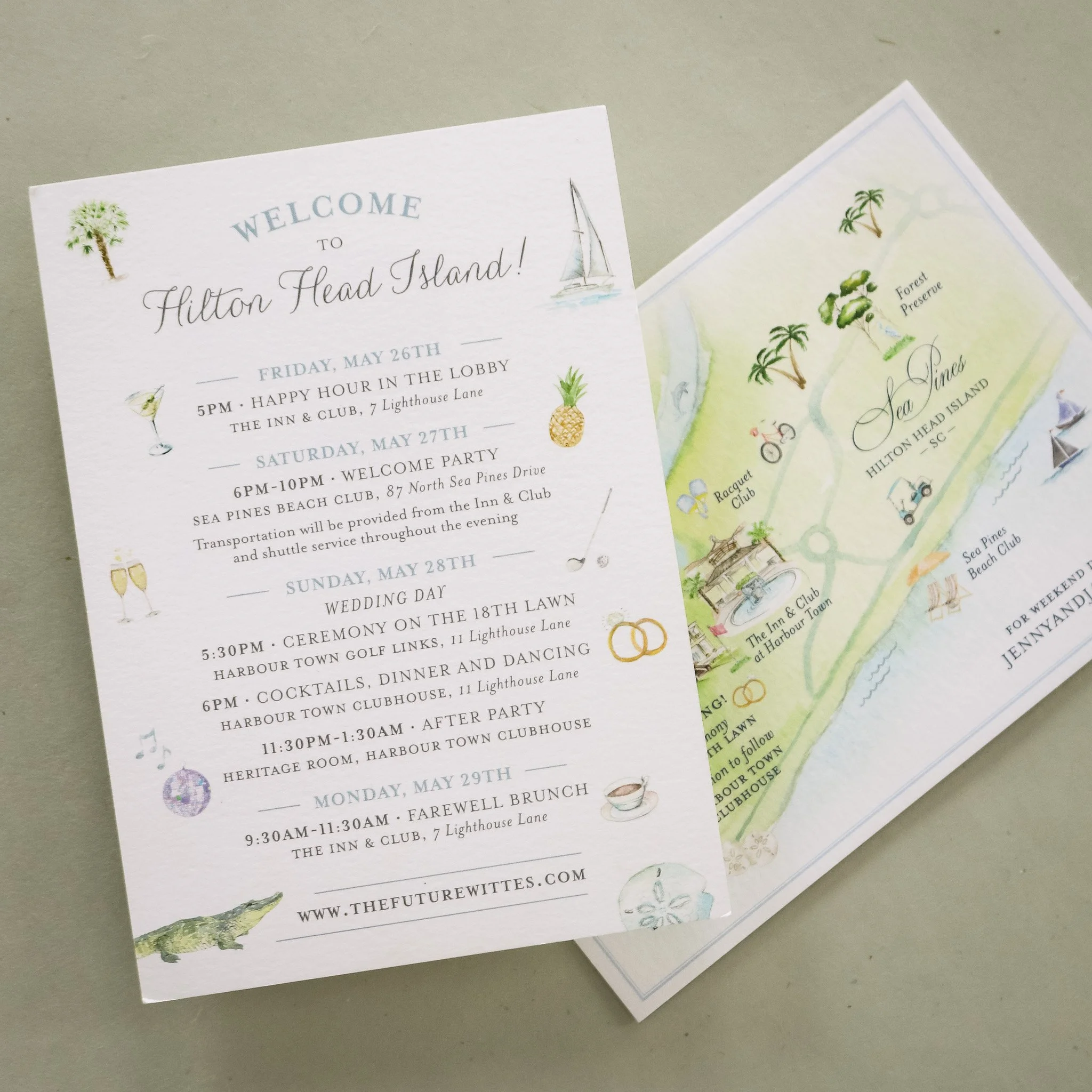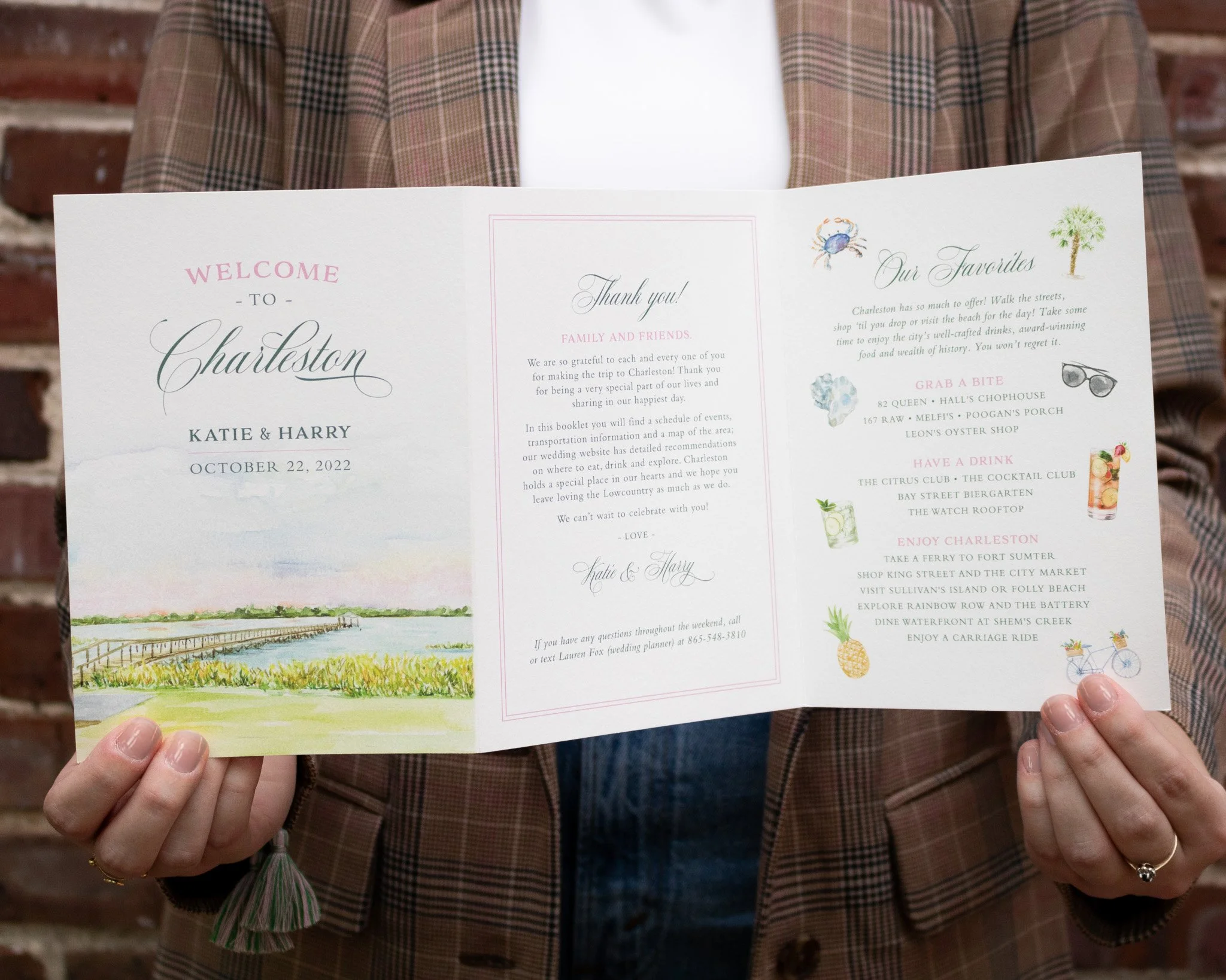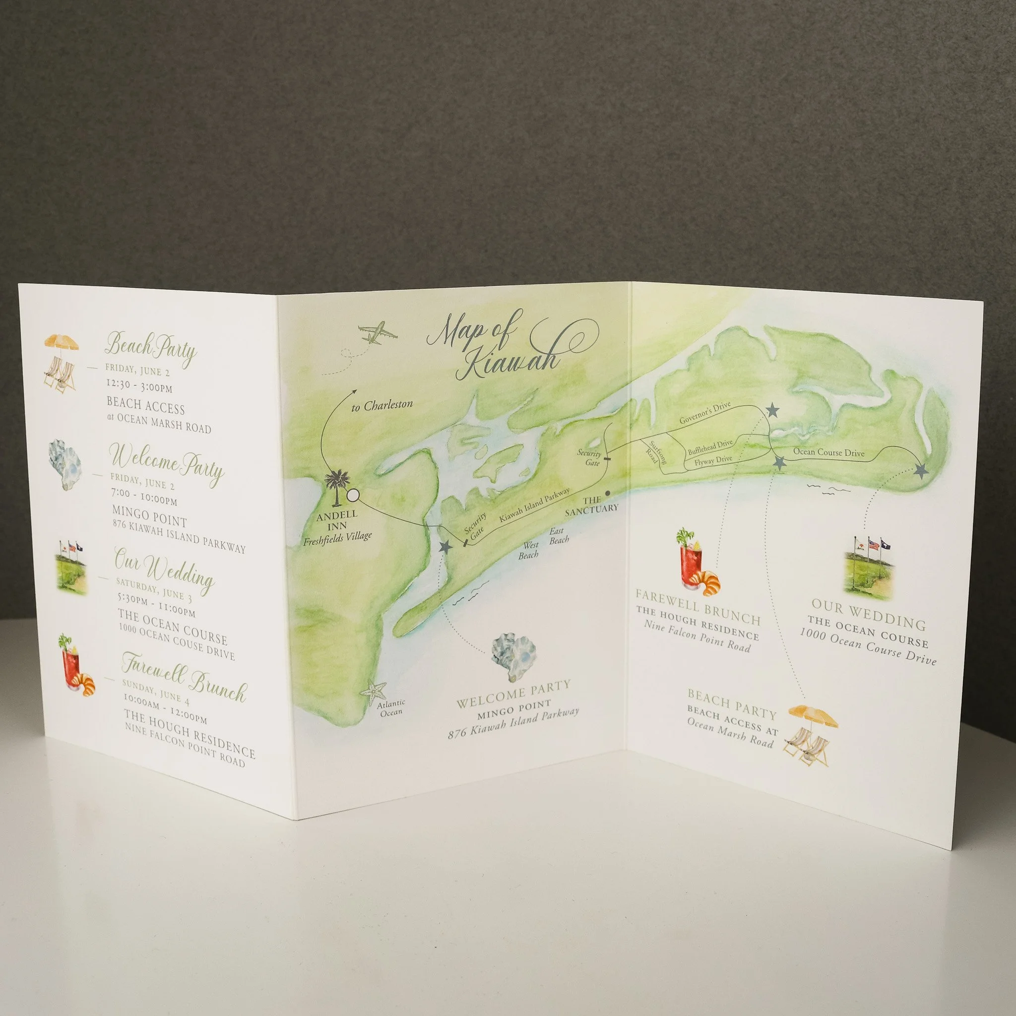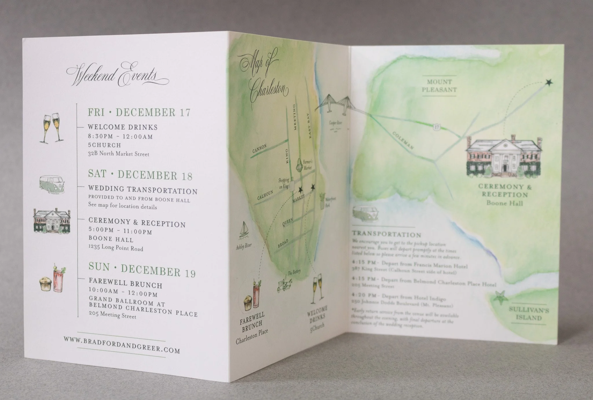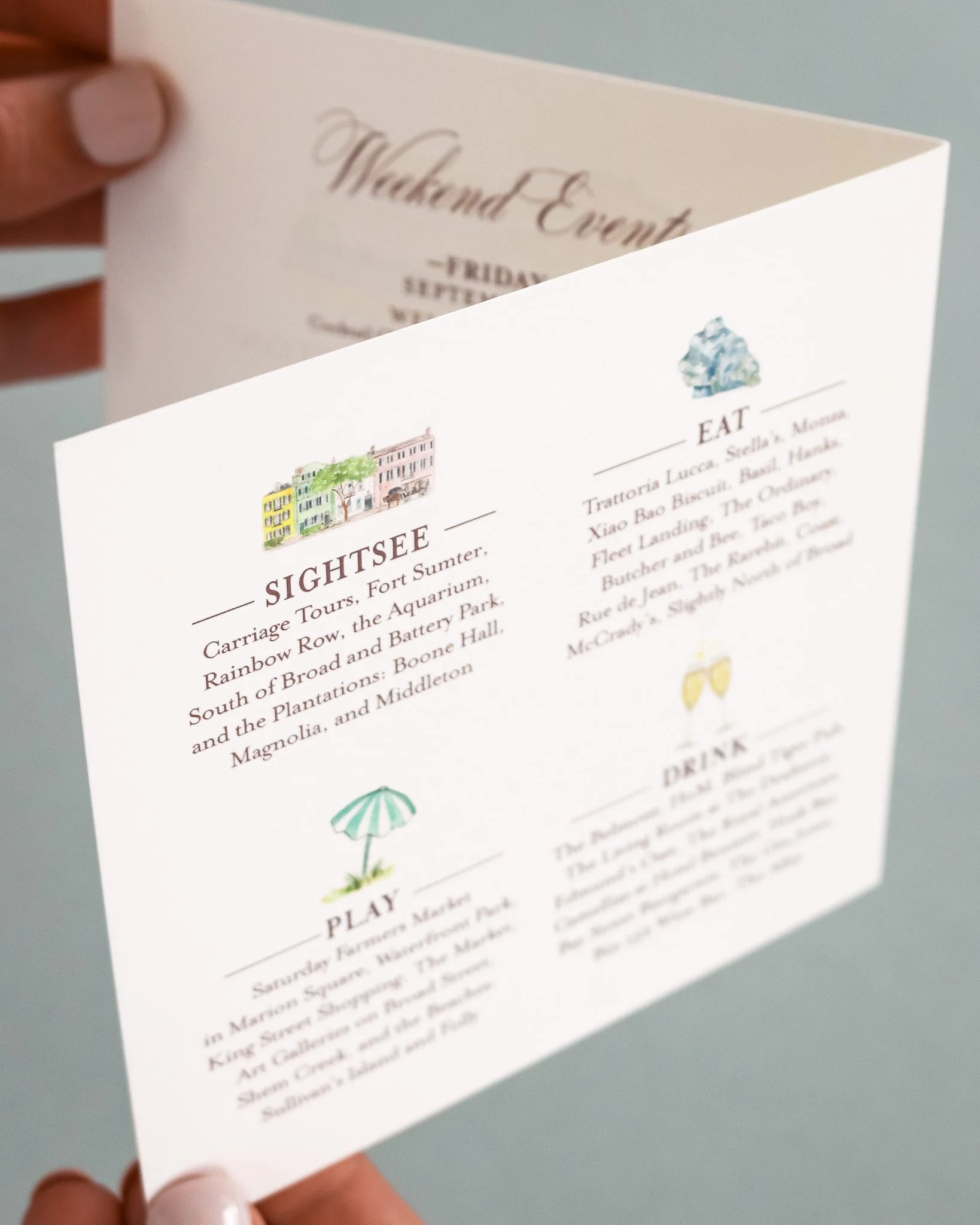 We design our welcome itineraries to compliment a bride’s invitation suite, while informing guests of key wedding information. An itinerary can be as simple as a thank you note or as elaborate as a tri-fold map.