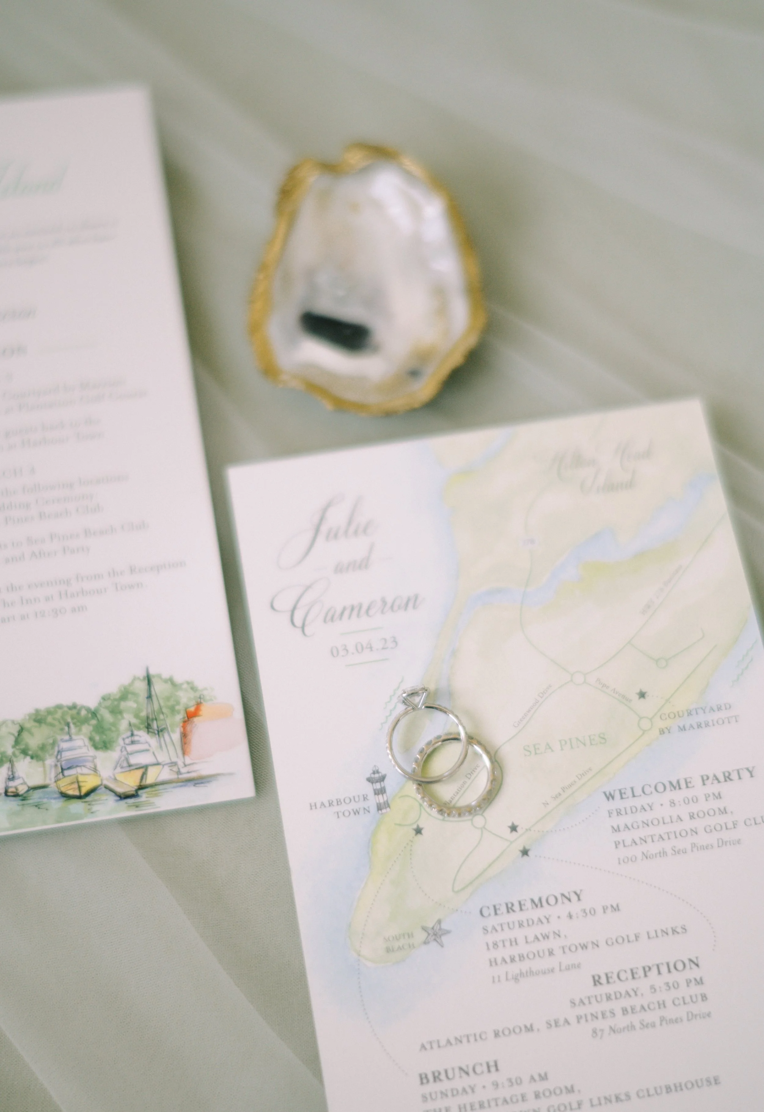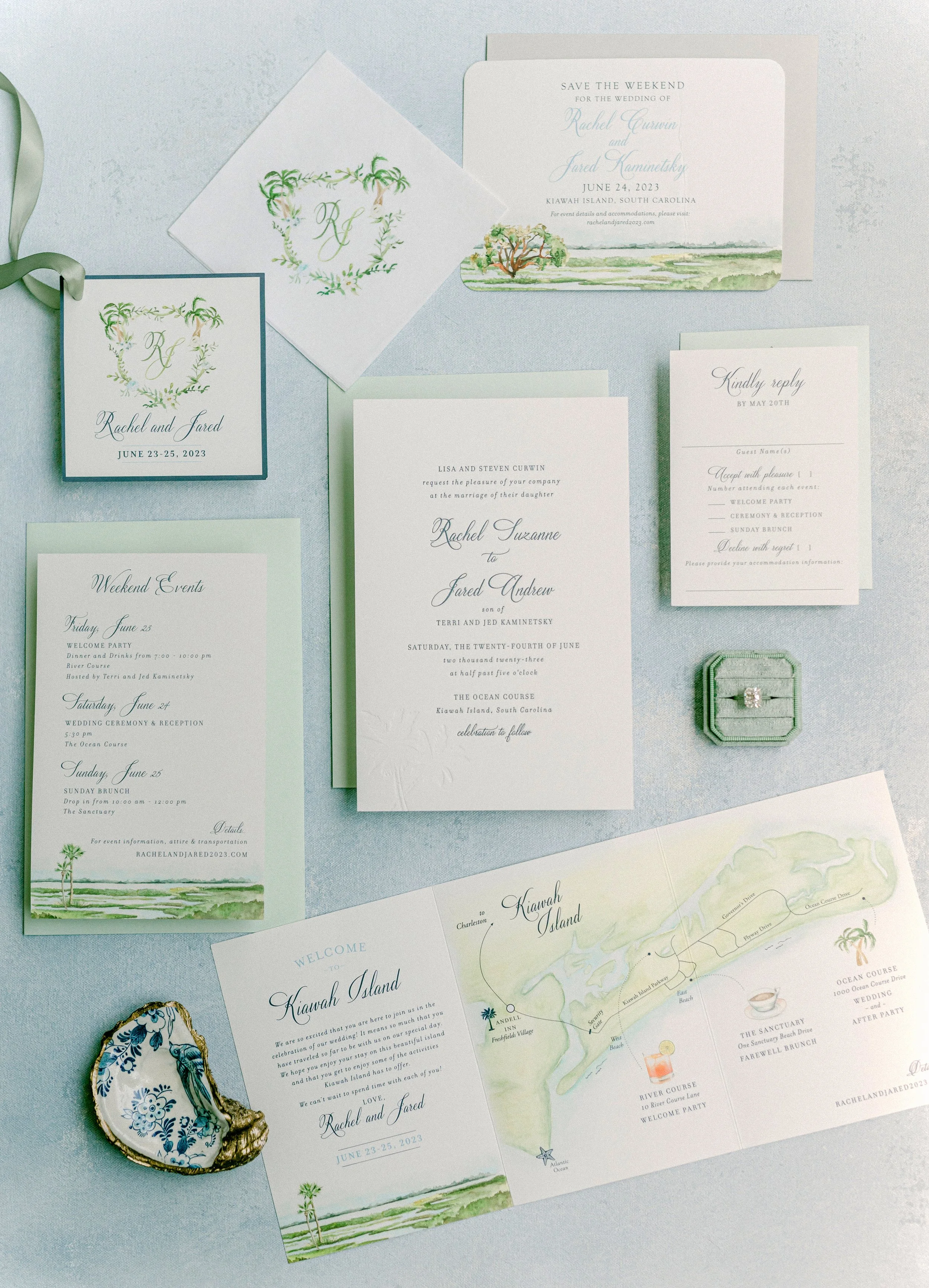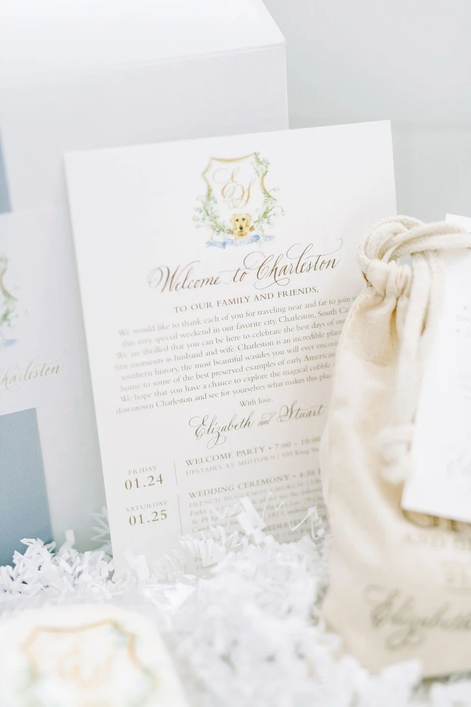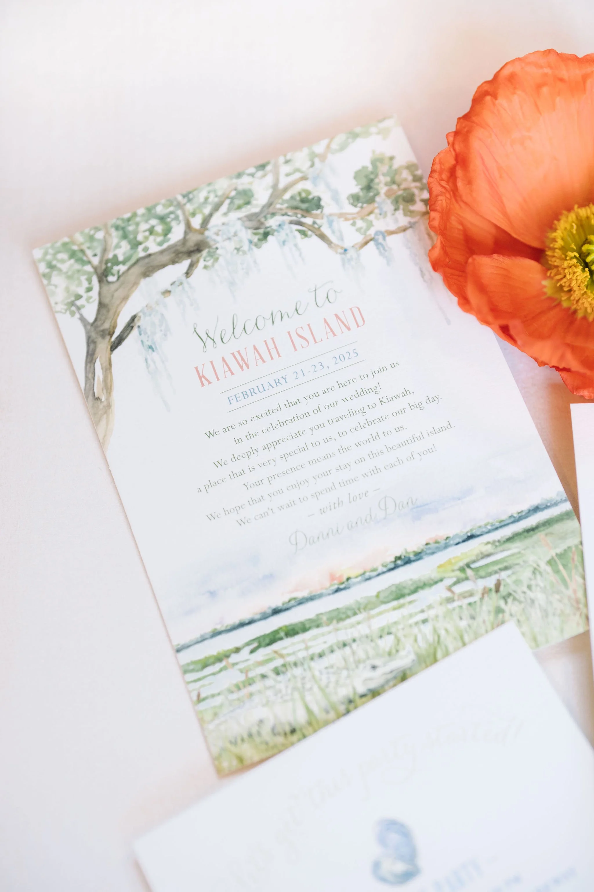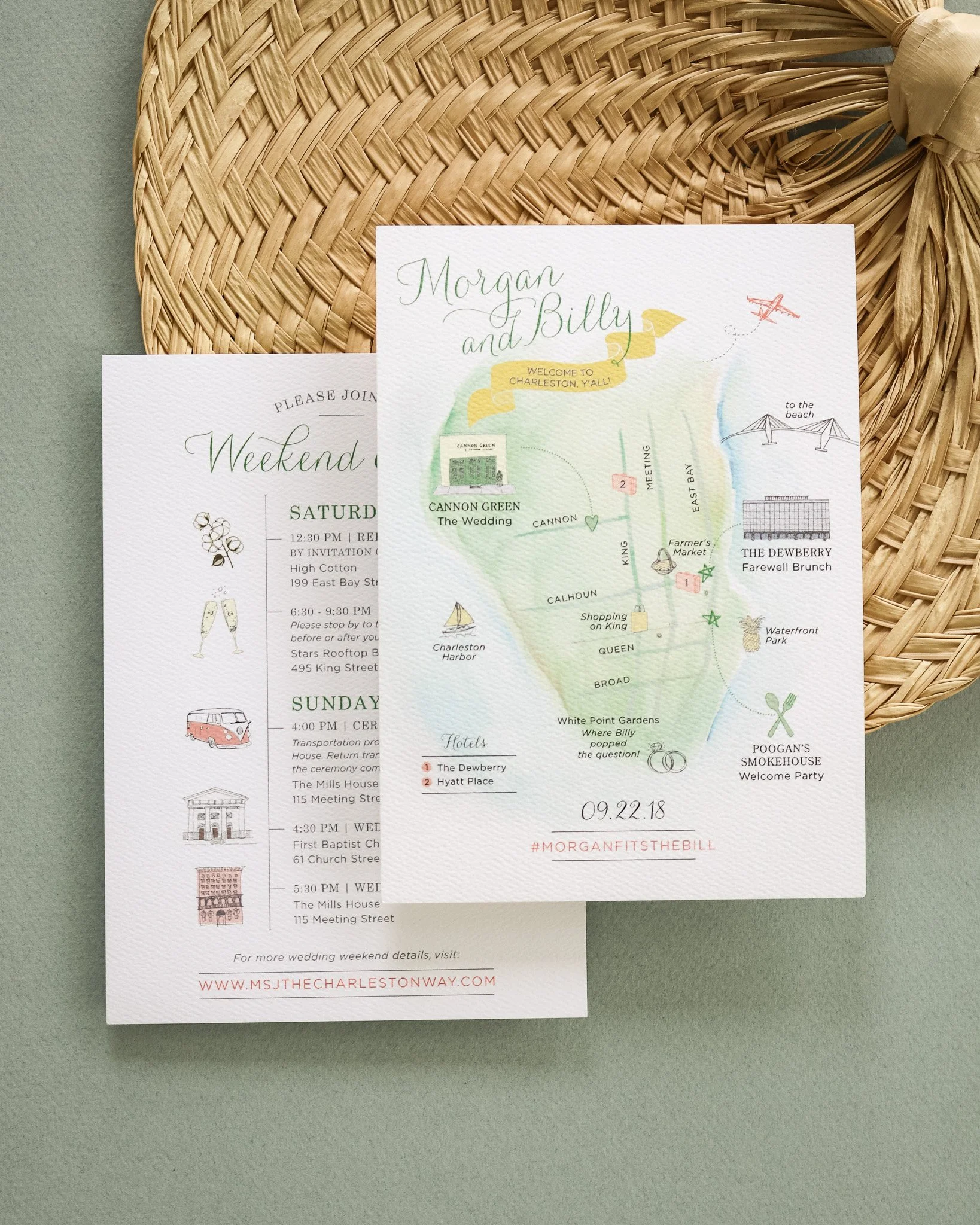 We design our welcome itineraries to compliment a bride’s invitation suite, while informing guests of key wedding information. An itinerary can be as simple as a thank you note or as elaborate as a tri-fold map.